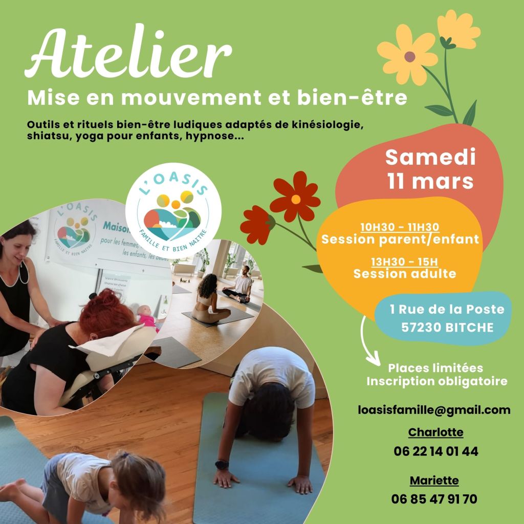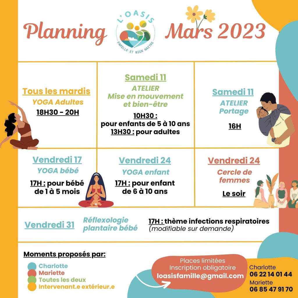 Retrouvez ici les différents événements et ateliers du mois de mars 2023 à l’Oasis Famille et Bien Naitre à Bitche :