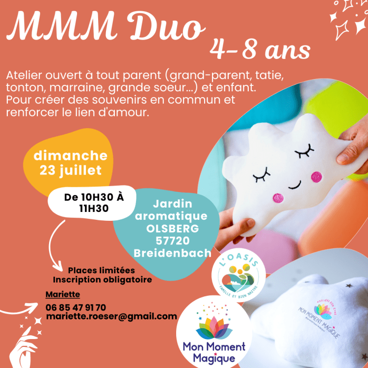 - 08/04/23 : Atelier Mon Moment Magique en DUOEnvie de partager un moment unique et privilégié avec votre enfant? Inscrivez-vous à l’atelier MMM DUO pour vous détendre en famille tout en s’amusant ! Envie de vous offrir un espace de découverte et de complicité partagé dans la bienveillance, le respect tout en s’amusant? En tant qu’animatrice, c’est ce que je vous propose en participant à l’atelier Mon Moment MagiqueLire la suite « 08/04/23 : Atelier Mon Moment Magique en DUO »