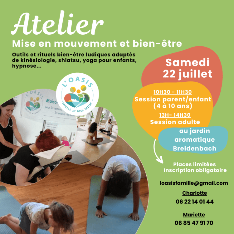 - 22/07/23 : Atelier de mise en mouvementBesoin de vous mettre en mouvement ? De faire circuler l’énergie dans le corps ? De vous (re)connecter à la nature? Inscrivez-vous à notre Atelier Mise en mouvement et bien-être pour vous détendre en famille, seul.e ou entre ami.e.s ! SPECIAL EXTERIEUR cet été. Durant ce moment, vous allez acquérir des outils et rituels bien-être ludiques, faciles à utiliser et mettre enLire la suite « 22/07/23 : Atelier de mise en mouvement »