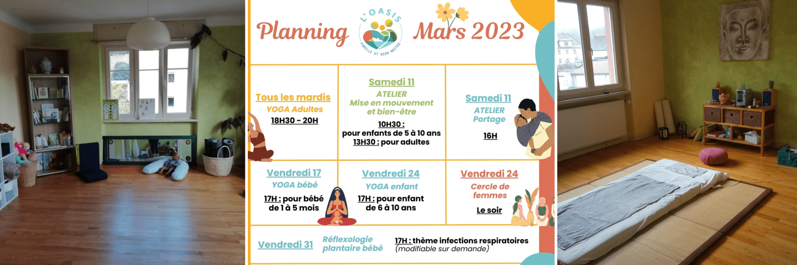 Retrouvez ici les différents événements et ateliers du mois de mars 2023 à l’Oasis Famille et Bien Naitre à Bitche :